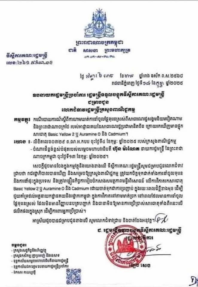 សេចក្តីដូចមានចែងក្នុងកម្មវត្ថុនិងយោងខាងលើ ទីស្តីការគណៈរដ្ឋមន្ត្រីសូមជម្រាបជូនលោកជំទាវ ជ្រាបថា រាជរដ្ឋាភិបាលបានឃើញ និងសម្រេចឱ្យក្រសួងពាណិជ្ជកម្ម ត្រូវយកចិត្តទុកដាក់ទាំងការនាំចូលទុរេន និងការដាំដុះក្នុងប្រទេស និងត្រូវពន្លឿនកិច្ចការរៀបចំកសាងសមត្ថភាពមន្ទីរពិសោធន៍ លើការវិភាគរកសារធាតុ Basic Yellow 2 ឬ Auramine O និង Cadmium ដោយចាត់ទុកជាការប្រញាប់ ក្នុងរយៈពេលដ៏ខ្លីខាងមុខ ដើម្បី ជួយគាំទ្រដល់អគ្គនាយកដ្ឋានគយនិងរដ្ឋាករកម្ពុជា ក្នុងការវិភាគនៅតាមមាត់ច្រក នៅពេលដែលមានការនាំចូល ផ្លែទុរេនស្រស់ ដែលមិនមានវិញ្ញាបនបត្របញ្ជាក់ និងធានាមិនឱ្យមានការប្រើប្រាស់សារធាតុទាំងពីរនេះលើ ផលិតផលក្នុងស្រុក ដើម្បីការពារអ្នកប្រើប្រាស់។